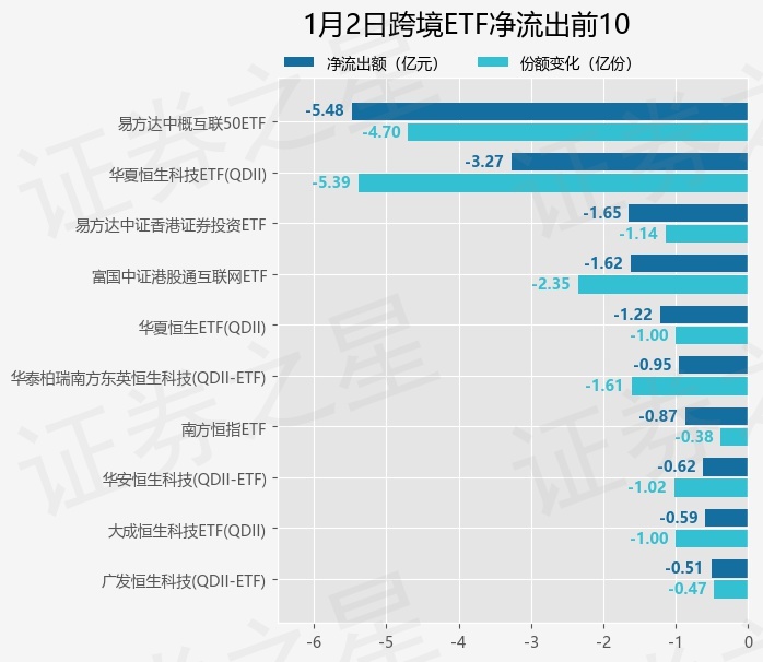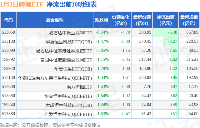 当日有36只跨境ETF基金出现资金净流出,其中净流出排首位的是易方达中概互联50ETF(513050),份额减少了4.7亿份,净流出额为5.48亿元。