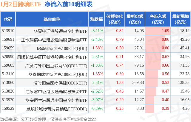 当日有56只跨境ETF基金出现资金净流入,其中净流入排首位的是华夏中证港股通央企红利ETF(513910),份额增加了8200.0万份,净流入额为1.09亿元。
